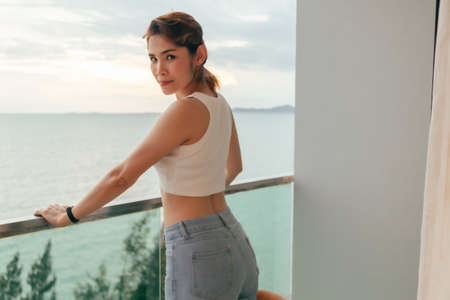 Beautiful Asian woman enjoy looking the sea view from the balcony of the hotel.