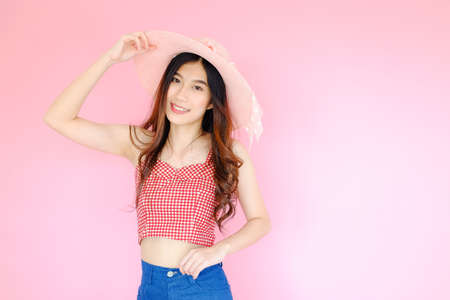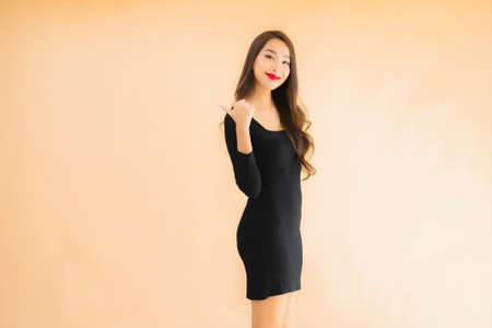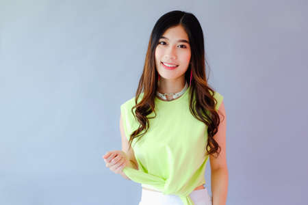 Portrait beautiful young asian woman happy smile in action on color isolated background
