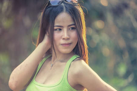 fasion of asia young Woman wearing green vest stand in park, vintage effect