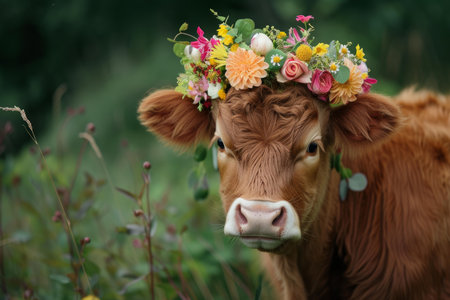 Charming cow adorned with a vibrant flower crown poses against a soft, natural backdrop