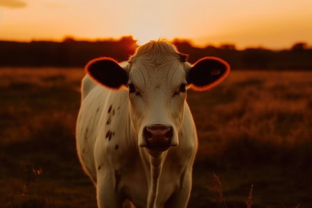 A cow stands peacefully in an open field during sunset, surrounded by softly blurred grass, capturing a tranquil moment of nature at dusk.