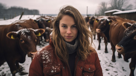 This charming close-up image features a cow wearing a cozy scarf, standing gracefully in a winter landscape. Its gentle expression adds warmth to the cold scene.