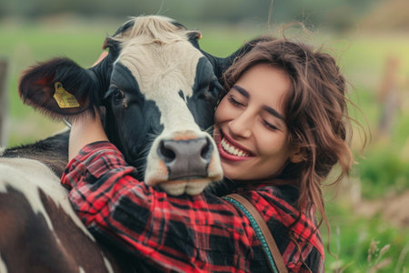 A woman beams with happiness while embracing a cow. The vibrant green fields surround them, reflecting a peaceful day in the countryside.