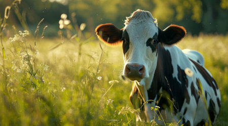 A black and white cow grazes peacefully in a lush green meadow filled with wildflowers. The rolling hills and soft lighting create a classic and scenic pastoral landscape.