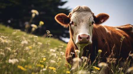 a cow, with expressive body language and exaggerated expressions, takes center stage in this uhd image. the fisheye effects add a unique touch, while strong facial expressions capture the cow's personality. rendered in unreal engine, the photo showcases selective focus, highlighting the cow's ability to make the world go round. ai generated