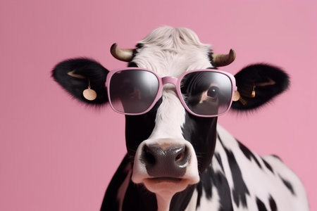 Fashionable cow in sunglasses poses against soft pastel studio backdrop, exuding playful vibes.