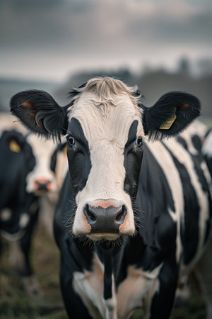 Close up portrait of curious cow among herd of cows and bulls. Dairy farm animals are grazing in paddock. Animal husbandry in the countryside.