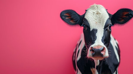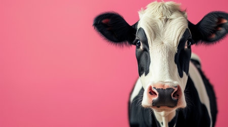 Happy dairy cattle on pastel background for fashion shoot with 35mm lens and text space