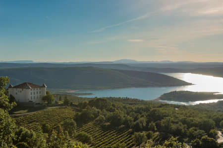 chateau in Aiguines and St Croix Lake at background, Var Department, Provence, France