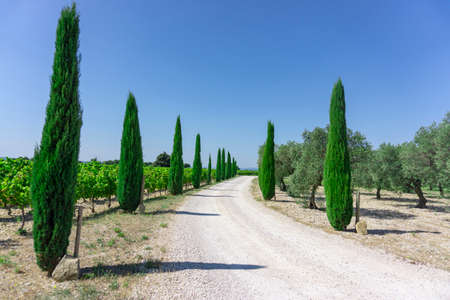 The rural road entry to vineyard and olive oil trees organic farmland, evergreen pine trees on both side under vivid blue sky, vacqueyras village in France