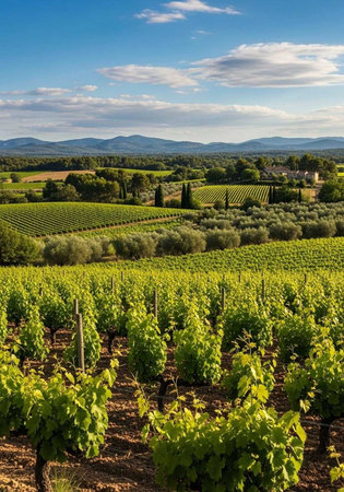 A serene vineyard landscape with lush greenery under a blue sky with scattered clouds