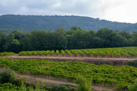 Rows of ripe wine grapes plants on vineyards in Cotes de Provence near Grimaud, region Provence, south of France, wine making in France