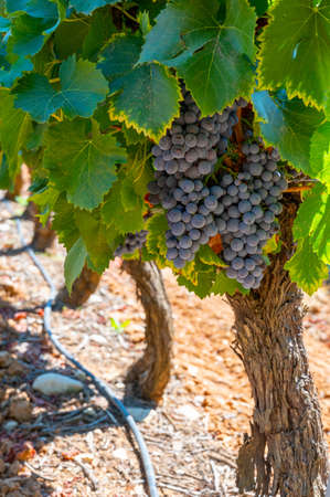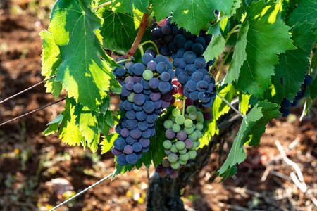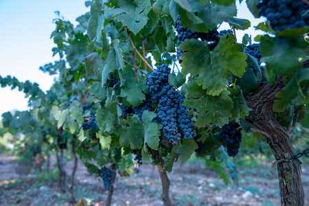 Rows of ripe syrah wine grapes plants on vineyards in Cotes de Provence, region Provence, south of France, ready to harvest, winemaking in France