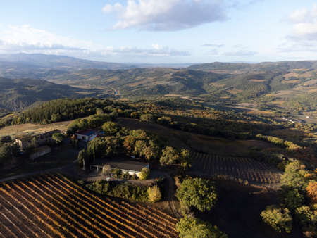 Aerial view on hills, colorful autumn on vineyards near wine making town Montalcino, Tuscany, rows of grape plants after harvest, Italy