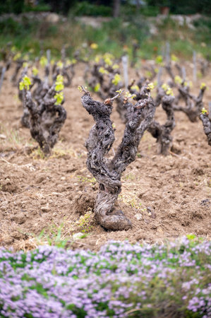 Old grape trunks on vineyards of Cotes de Provence in spring, Bandol wine region near Le Castellet village, wine making in South of France
