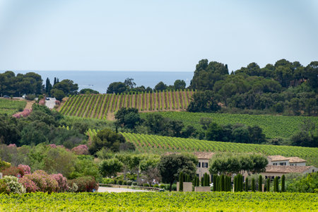 Landscape of French Riviera, view on hills, houses and green vineyards Cotes de Provence, production of rose wine near Saint-Tropez, Gassin, Pampelonne beach, Var, France in summer