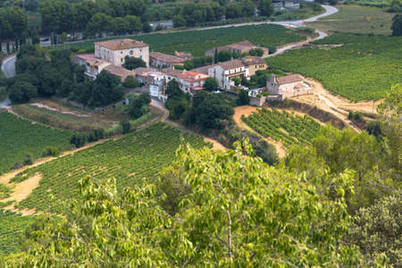 Aerial view on medieval buildings and vineyards in sunny day, vacation destination, famous wine making village Chateauneuf-du-pape in Provence, France
