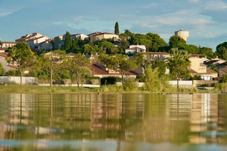 homes of Villeneuve-de-la-Raho mirroring in a lake