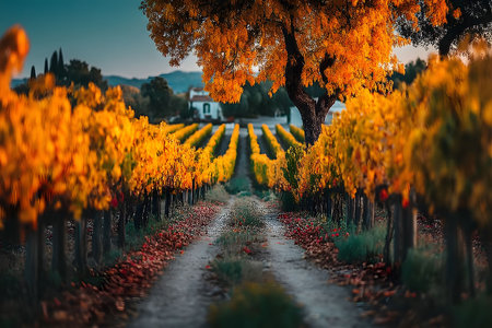 A stunning autumn vineyard scene illuminated by the warm glow of sunset. vibrant golden leaves on grapevines create a vivid contrast against a tranquil countryside backdrop. perfect for nature-inspired wall art and decor. Generative AI