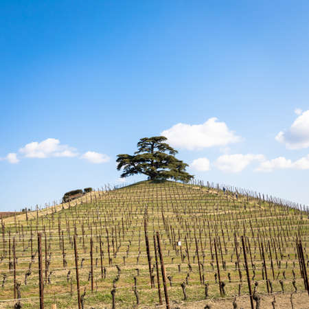 Barolo and Barbaresco countryside in Piedmont region, Italy. Vineyard with grapes cultivation for red wine.