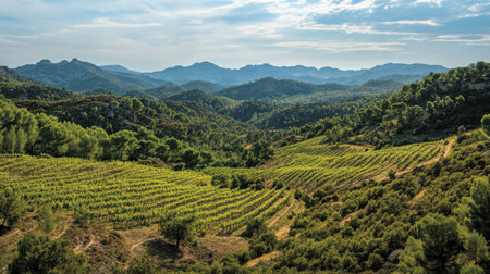 Vineyards stretch across the rolling hills of Priorat, Catalonia, illuminated by the warm afternoon sun, showing a serene landscape where nature thrives.