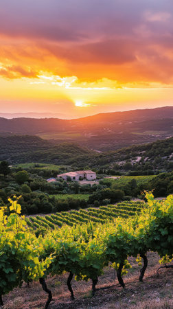Amidst rolling hills, the sun sets behind a vineyard, casting golden hues across the landscape. This tranquil moment highlights the peacefulness of rural life and nature's beauty.