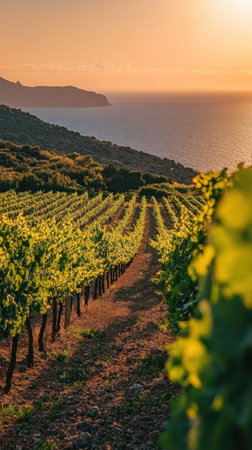 A serene vineyard landscape bathed in golden sunlight during the golden hour, showcasing lush greenery and hills in a tranquil rural setting.