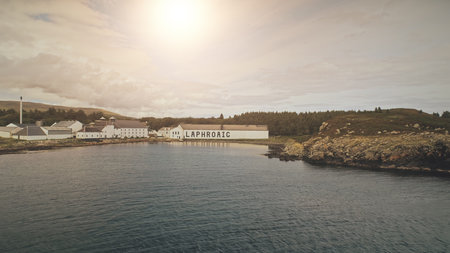 2018.08.07 - Laphroaig Whiskey distillery, Port town Ellen, Islay Island, United Kingdom, Europe. Alcohol production industry manufactoring. Nobody nature sun landscape at ocean coast aerial