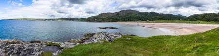 Panoramic view of Smirisary beach, on the west coast of Scotland, during sunset with evening light and clouds.