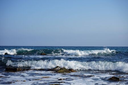Turquoise sea stone beach, breaking waves in bright sunlight. Colorful bright sea background. The concept of summer, vacation, travel. The purest sea water, large stones on the beach close-up