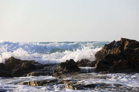 Beautiful view of the restless sea near the stone coast. Natural landscape