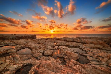 Rocky seashore seascape with wavy ocean and dramatic and beautiful sunset at sea caves coastal area in Paphos, Cyprus