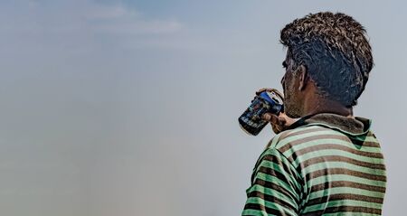 Middle aged Indian male wearing striped tshirt, thinking deeply while quenching his thirst on sunny noon by drinking water/cold drink/beer from an aluminum can. Isolated space on left for quote/banner