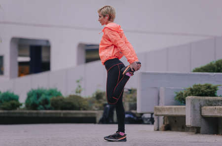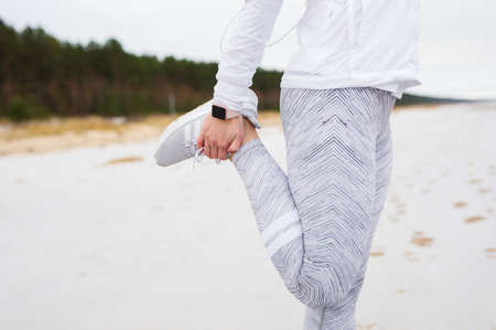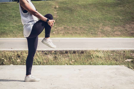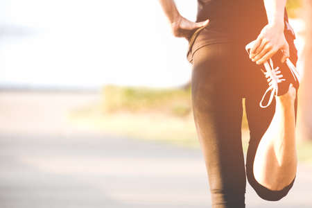 Athlete woman doing some stretching exercises legs before running on outdoor.