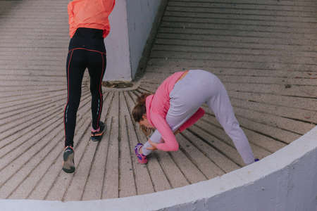 Healthy two sporty young girls jogging and stretching outdoors