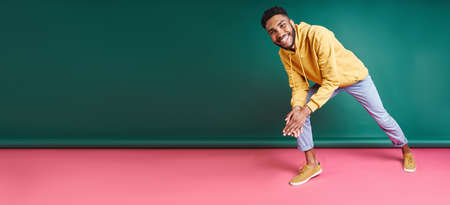 Cheerful African man looking at camera while standing against colorful background