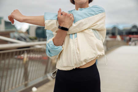 Close up of sportive woman doing stretching exercise on footbridge in the city