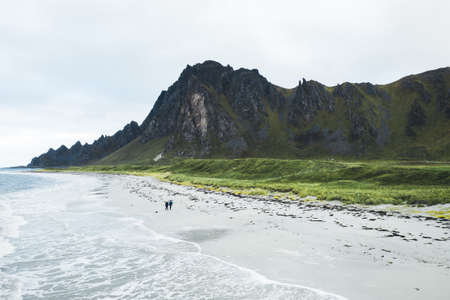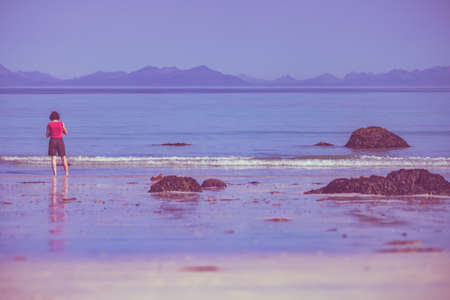 Tourist woman relaxing walking on sea shore. Coast of Gimsoya island, Gimsoysand sandy beach in summer. Nordland, Lofoten Norway.