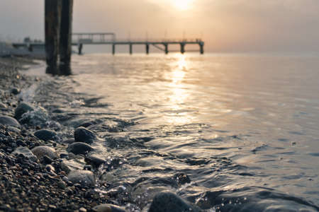 Rocky beach with calm wave of the sea with blurred sunset background
