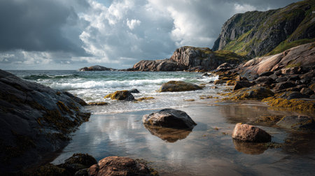 A tranquil seascape featuring a rocky shoreline beneath a dramatic, cloudy sky. The calm waters reflect the serene landscape, inviting exploration.