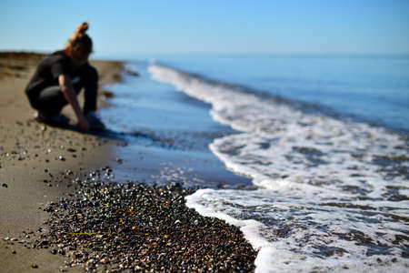 Lonely person on ocean beach landscape photo. Beautiful nature scenery photography with sunset sky on background. Idyllic scene. High quality picture for wallpaper, travel blog, magazine, article
