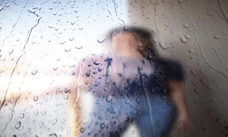 Drops of water flow down the glass in the rain