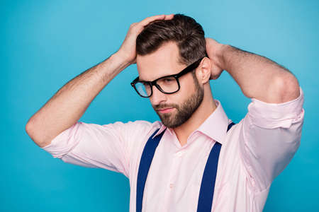 Closeup photo of handsome business man hold arms on head check neat hairdo after salon styling groomed appearance wear specs pink shirt suspenders isolated blue color background