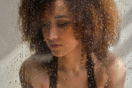 Defocused image of young female. Art portrait. Feminine beauty. Double exposure blur sensual pensive woman silhouette with steamed glass. Skincare wellness. Melancholy dream.