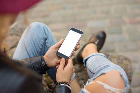 Teenager girl holding smartphone in her hands.