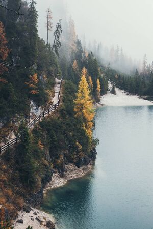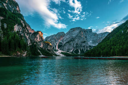 Dolomites, Italy - July, 2019: Beautiful lake in the italian Alps, Lago di Braies
