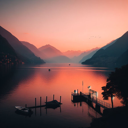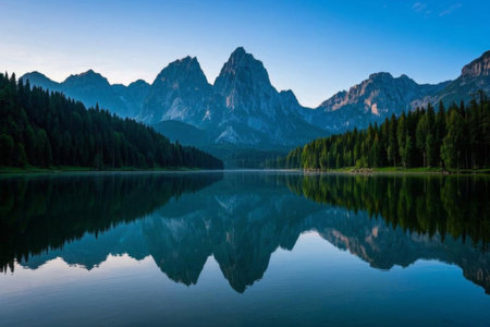 The tranquil lake mirrors surrounding mountains and lush forests, creating a perfect moment of serenity during the early morning hours. Nature invites calmness and reflection.