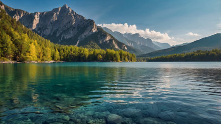 In the morning light a serene landscape unfolds, where the tranquil lake reflects the majestic mountains and their enchanting surroundings, creating a scene that feels both timeless and magical