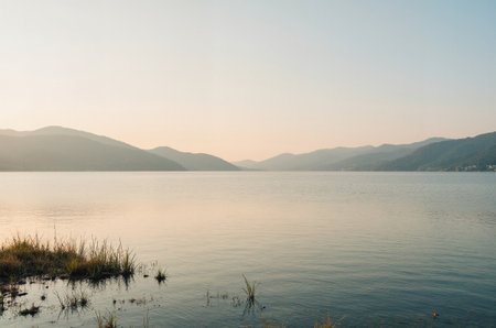 Sunset casts a warm glow over the tranquil lake, with silhouettes of mountains in the background and grass swaying gently by the shore.