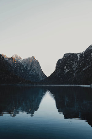 view of well-known tyrolean lake lago di Braies, Dolomites. Italy